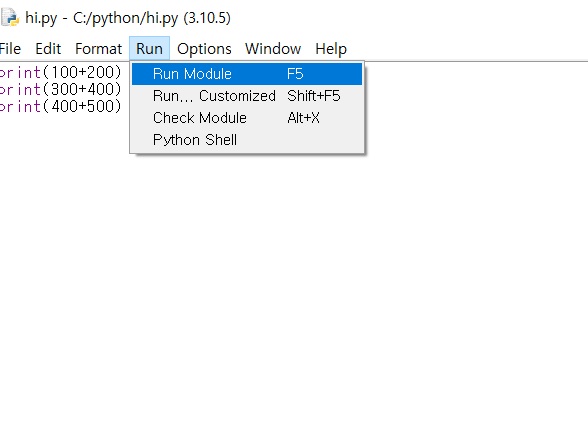 이제 입력한 값을 한번에 시행해 볼것인데, 위에 run을 누르고 run module을 누르거나 run을 누르고 F5버튼을 누르면 시행된다