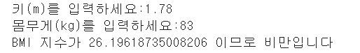 height = float(input("키(m)를 입력하세요:"))weight =float(input("몸무게(kg)를 입력하세요:"))bmi = weight/(height**2)if bmi <= 18.5:print("BMI 지수가",bmi,"이므로 저체중입니다")elif bmi <= 22.9:print("BMI 지수가",bmi,"이므로 정상입니다")elif bmi <= 24.9:print("BMI 지수가",bmi,"이므로 과체중입니다")else:print("BMI 지수가",bmi,"이므로 비만입니다")