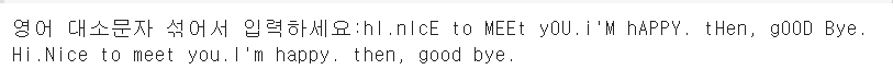 sentence = input("영어 대소문자 섞어서 입력하세요:")sentence = sentence.lower().split(".") #sentence를 전부 소문자로 바꾼 뒤 .을 기준으로 sliceanswer = [] #answer을 리스트화for s in sentence:s = s.capitalize() #첫글자 대문자if s in "i'":s =s.replace("i'","I'")#i'를 I'로 바꾸세요 I는 대문자answer.append(s)elif s in "i":s = s.replace("i","I")answer.append(s)elif s in " i":s = s.replace(" i"," I")answer.append(s)elif s in "i ":s = s.replace("i ","I ")answer.append(s)else:answer.append(s)print(".".join(answer))