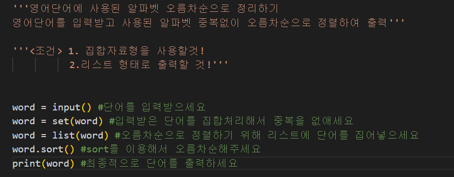 《김변수와 시작하는 코딩생활 with 파이썬》수료증 인증 (0) 2022.09.01 《김변수와 시작하는 코딩생활 with 파이썬》딕셔너리 (0) 2022.08.19 《김변수와 시작하는 코딩생활 with 파이썬》 ⭐필수⭐12일차 출석인증 #문장 내 단어 오름차순으로 출력하기 (0) 2022.08.18 《김변수와 시작하는 코딩생활 with 파이썬》 집합(SET) - 합집합, 차집합, 교집합, 하나 추가하기, 여러개 추가하기, 삭제하기 (0) 2022.08.18 《김변수와 시작하는 코딩생활 with 파이썬》 튜플 (0) 2022.08.17