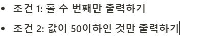 더보기def gugudan(number): #구구단 함수 정의print("몇단?:",number) #입력받은 값 출력for i in [number]: #해당 숫자 출력for j in range(1, 10, 2): #홀수만 곱함if i*j < 50:#곱한 값이 50이하일때만 출력print(i, "x" ,j, "=",i*j)number = int(input("몇단?:")) #숫자 입력받기gugudan(number)Q2. 가위바위보 업그레이드 버젼을 함수로 만들어 봅시다. 아래와 같은 조건을 만족해 주세요.