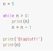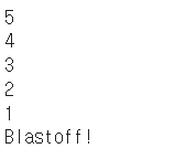그래서 출력문을 보면 5,4,3,2,1차례로 다 출력 후 루프에서 나온 뒤 마지막 출력물 Blastoff!가 나온 것을 볼 수 있다