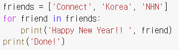 ['Connect', 'Korea', 'NHN']를 friend에 하나씩 넣으라는 얘기다그리고 Happy New Year!! friend를 반복해서 출력해라라는 뜻이다모든 반복이 끝나면 루프를 빠져나와 마지막 줄이 시행된다<08.리스트강의 들으러 가기>모두를 위한 파이썬 (PY4E)