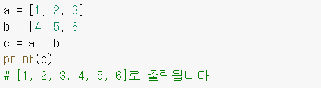 리스트 타입 역시 문자열과 마찬가지로 '+'기호를 사용해서 다른 리스트와 합칠 수 있다