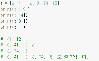 마지막 예시의 경우, [:]이니까 전체 다 출력하니까 리스트 t 전체가 출력되어서 [9,41,12,3,74,15]가 나온다