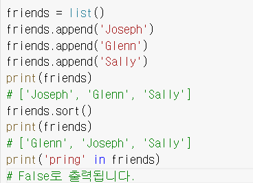 빈 리스트 만들기 ->항목 추가하기 -> 항목 정렬하기-> in을 활용해 'pring'이 친구 목록에 있는지 확인하기