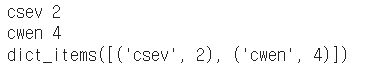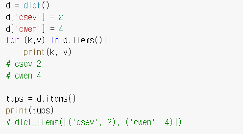 - 딕셔너리에서 items 메소드를 실행해 튜플로 이루어진 리스트 형태로 만든다.
