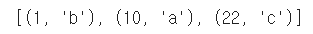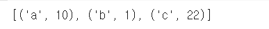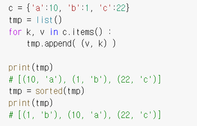 - 이 리스트를 sorted 함수로 정렬한다. 그러면 각각의 튜플의 왼쪽 값, 즉 키를 기준으로 정렬이 된다.