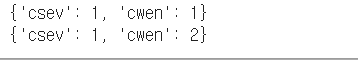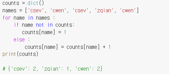 그렇지 않을 경우에는 counts 딕셔너리에 name이라는 키에 0이라는 값을 갖는 데이터를 추가하라는 의미다